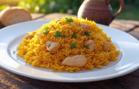 - 5Cook the chicken and rice Nestle the seared chicken thighs (skin-side up) into the rice mixture. Bring to a gentle simmer, then reduce the heat to low. Cover and cook for 20-25 minutes, until the rice is tender and the chicken is cooked through (internal temperature of 165°F/74°C).